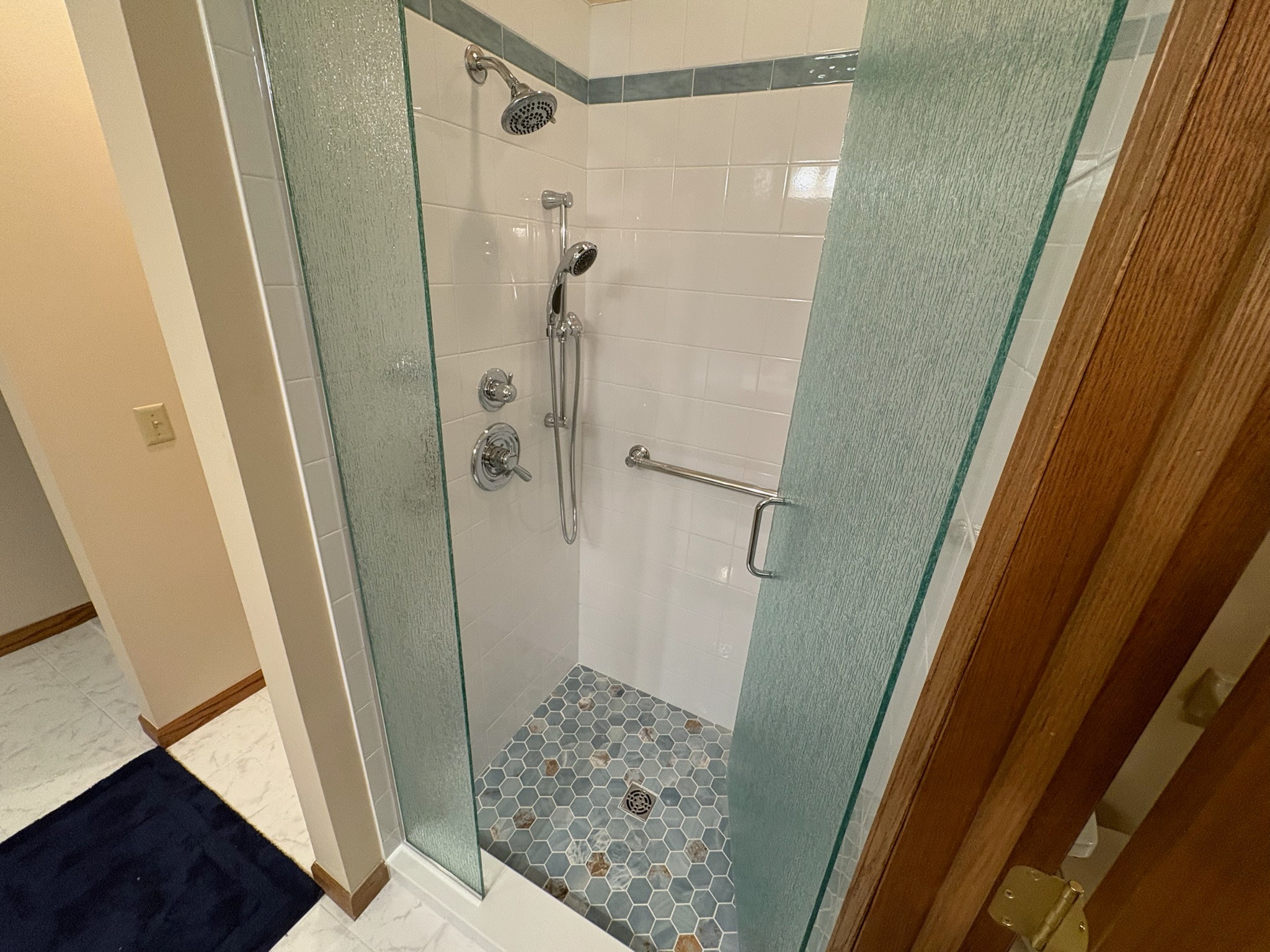 The bathroom was then transformed into a high-end, traditional-style master bathroom with luxury finishes throughout. The custom tile shower is paired with a frameless custom glass enclosure, creating a clean and open feel. Fixtures and trim feature chrome Delta finishes, tying together a timeless, traditional design. Every detail of the layout and finish selection was carefully executed to deliver both durability and elevated aesthetics.